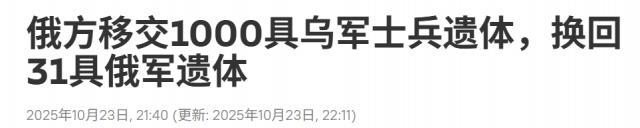 据俄媒报道,10 月 23 日,俄乌双方再次交换阵亡士兵遗体,俄方移交 1000 具乌军遗体,而乌方仅交还 31 具俄军遗体。